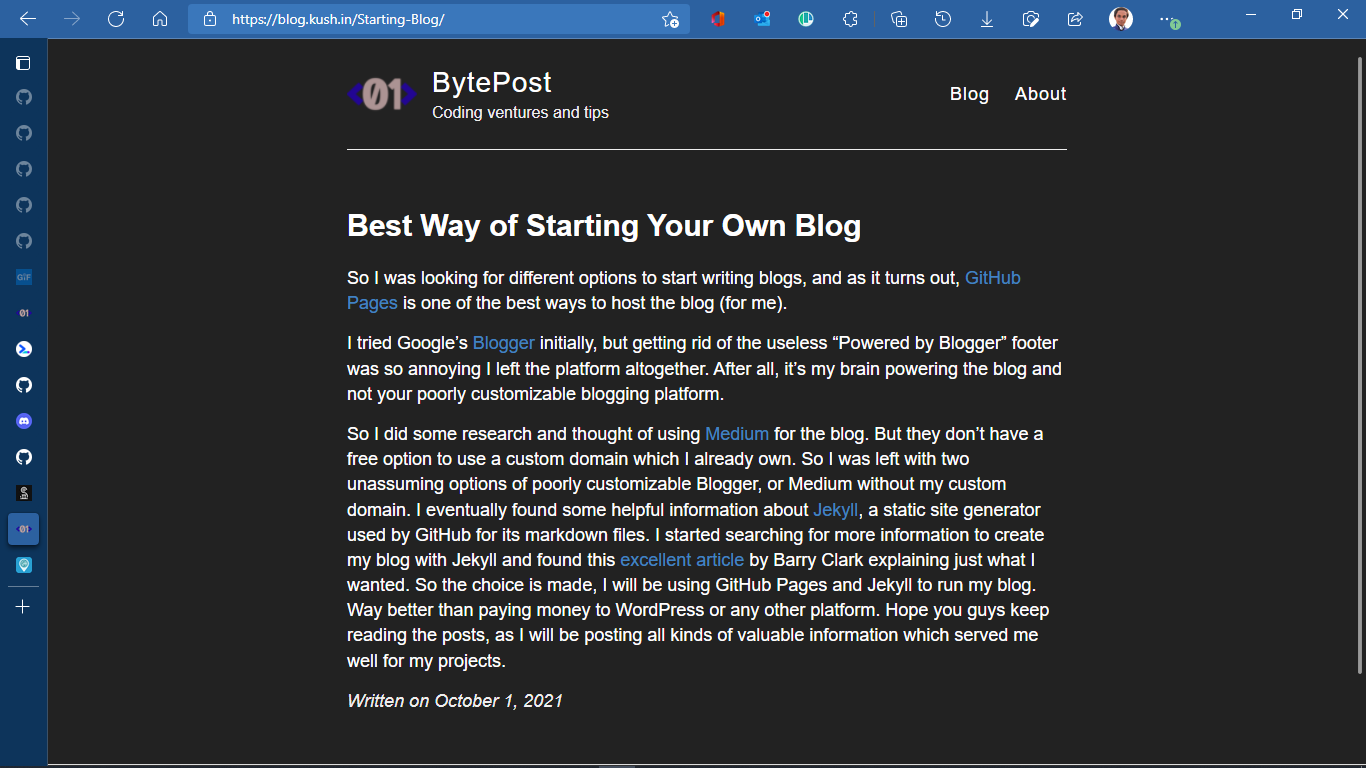 After a significant time of sticking with this cringe worthy page, I came to explore the YavaScript world beyond React. Fireship made me use sveltekit, and what better way of exploring a new framework than rewriting my blog. So that’s what I did.